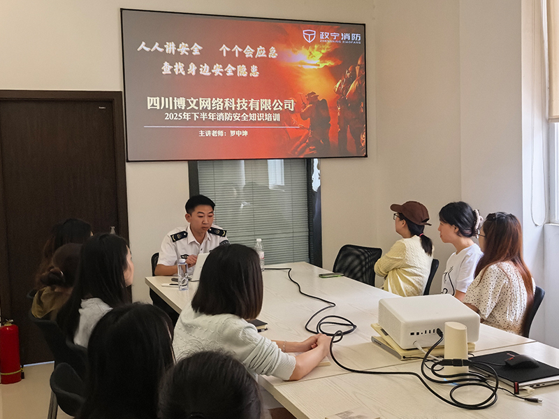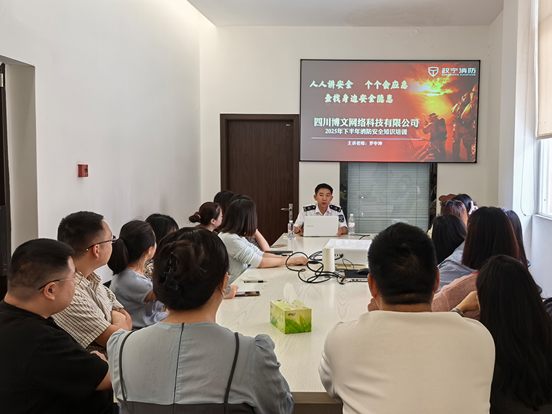 2025年9月20日上午,四川博文網絡科技有限公司開展以“人人講安全、個個會應急——查找身邊安全隱患”為主題的消防安全培訓。本次培訓活動特邀遂寧政寧消防專業教官羅中坤擔任主講,面向公司全體員工,系統開展消防安全知識宣講與應急技能實操訓練,進一步夯實企業安全文化建設,提升員工自我防護與突發火情應對能力。