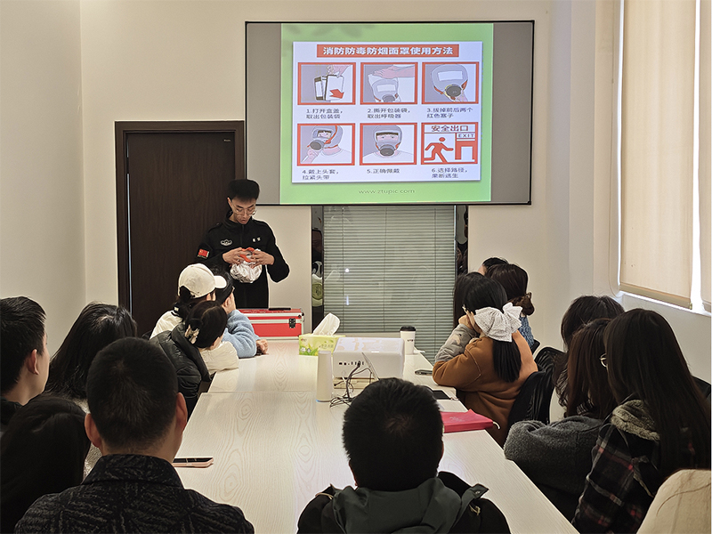 在器材使用環(huán)節(jié),鄭教官現(xiàn)場演示了便攜式水基滅火器、滅火毯、煙霧傳感器等常用消防設(shè)施的功能與操作方法,并結(jié)合圖示重點講解了消防防毒防煙面罩的正確使用方式,并指出“火災(zāi)中濕毛巾捂口鼻穿過煙霧”這一常見誤區(qū),提醒員工火場逃生時應(yīng)優(yōu)先佩戴防煙面罩或使用專業(yè)防護裝備,避免因錯誤操作導致窒息。